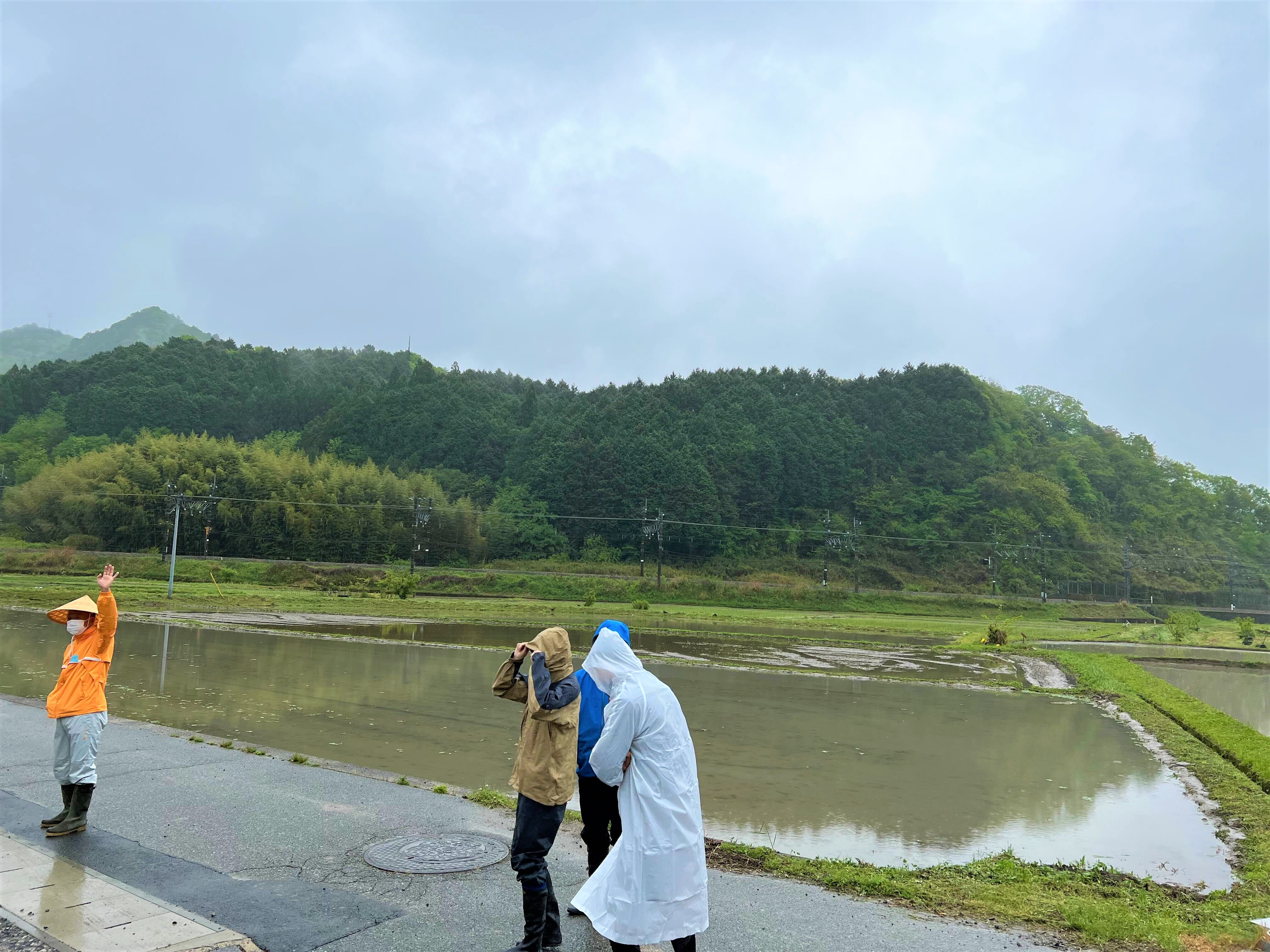 オリエンテーションを終えたあと、雨が降り少しひんやりとした空気の中、田植え作業を行う圃場へ移動します。私は田植え長靴を履いていましたが、サンダルを履いている方、靴下を重ね履きしている方など様々です。